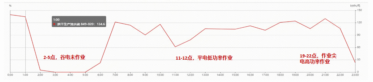 在設備數據、能耗數據透明化的基礎上,借助平臺數據分析,在重點能耗產線,銀輪力推“避峰就谷”的作業方式。避峰就谷就是不改變作業時間的基礎上,盡量保障優先在谷電平點時間用電,如果谷電平點時間不足,那么就在峰電,如果峰電時間還不夠就在尖電時間用電,以此類推。