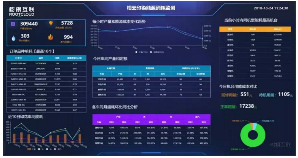樹根科技將印染設備聯網,通過云平臺實現計劃和工藝下達、工藝參數在線檢測、產量實時上報、能源數據實時監測、物流實時跟蹤、設備運行效率檢測等功能。