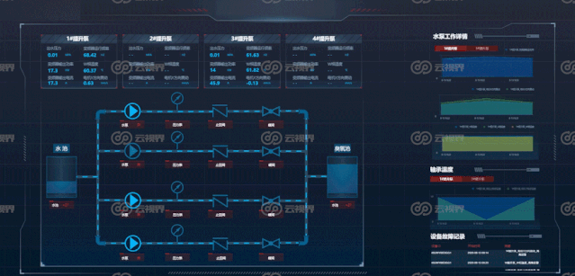 上圖是云視界制作的提升泵站可視化大屏。利用管道組件將提升泵站的工藝流程清晰直觀地展示在大屏上。基于此可視化界面,我們可以查看到生產(chǎn)線的運轉(zhuǎn)狀態(tài)和提升泵的各項參數(shù),從而實現(xiàn)對生產(chǎn)線的智能運維,幫助企業(yè)降本增效,促進(jìn)數(shù)字化轉(zhuǎn)型升級。
