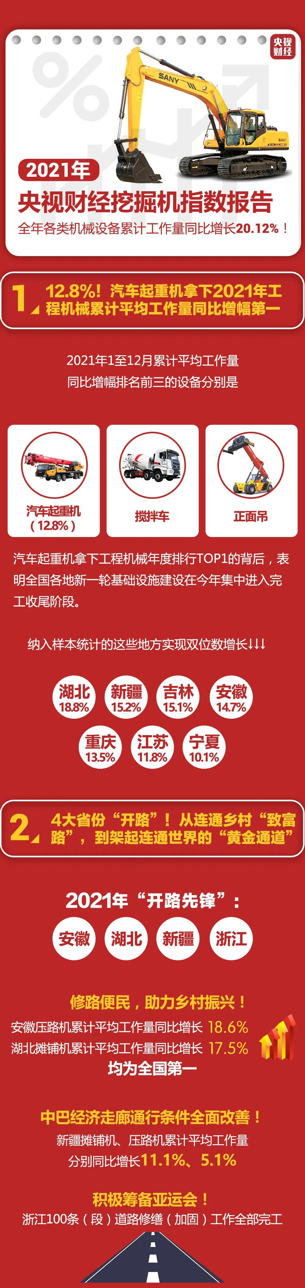 2021年我國持續(xù)加大基礎設施建設力度,為社會經濟發(fā)展注入強勁動力。央視財經挖掘機指數(shù)顯示,2021年我國各類工程機械設備累計工作量同比增長20.12%!