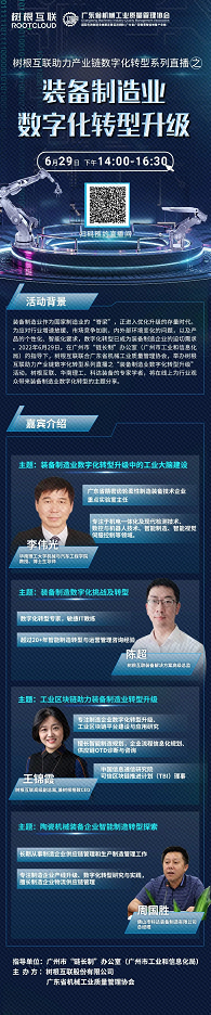 強化“硬本領”,提升“軟實力”。2022年6月29日,在廣州市“鏈長制”辦公室(廣州市工業(yè)和信息化局)的指導下,樹根科技聯(lián)合廣東省機械工業(yè)質(zhì)量管理協(xié)會,舉辦樹根科技助力產(chǎn)業(yè)鏈數(shù)字化轉型系列直播之“裝備制造業(yè)數(shù)字化轉型升級”活動。會上,樹根科技、華南理工、科達裝備的專家學者,將在線上為行業(yè)觀眾帶來裝備制造業(yè)數(shù)字化轉型的主題分享。