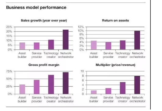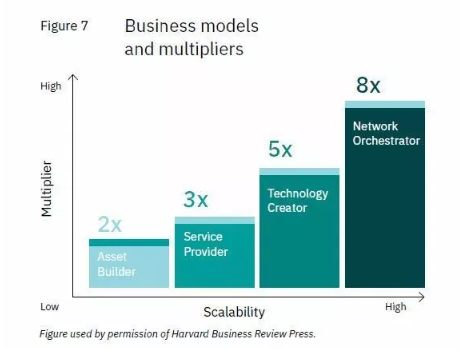 從資產(chǎn)建設(shè)者(Asset Builder)、到服務(wù)提供商(Service Provider)、到技術(shù)創(chuàng)新者(Technology Creator),再到最終的生態(tài)網(wǎng)絡(luò)協(xié)調(diào)者(Network Orchestrator)。不同的商業(yè)模式對應(yīng)了不同的價值乘數(shù)。