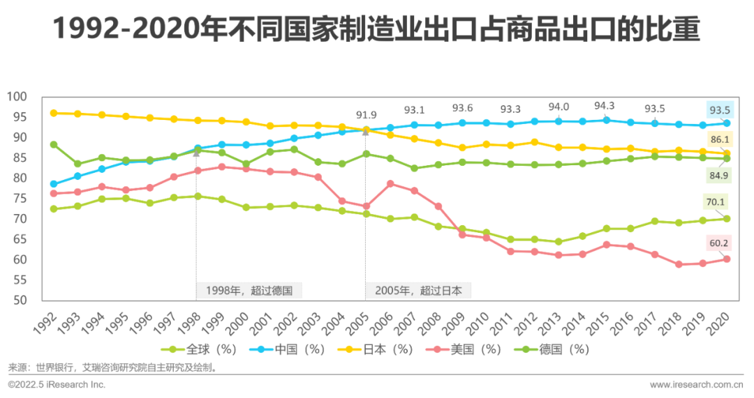 從世界銀行公布的制造業(yè)出口數(shù)據(jù)來(lái)看,中國(guó)制造業(yè)出口占商品出口的比重(以下簡(jiǎn)稱制造業(yè)出口)從1992年開(kāi)始,就已經(jīng)超過(guò)全球、美國(guó),并于1998年超過(guò)德國(guó)、2005年與日本持平。從2006年開(kāi)始,中國(guó)制造業(yè)出口一直維持第一的位置,是當(dāng)之無(wú)愧的制造業(yè)生產(chǎn)及出口大國(guó)。2020年,中國(guó)、日本、德國(guó)制造業(yè)出口分別為93.5%、86.1%、84.9%,中國(guó)的制造業(yè)出口優(yōu)勢(shì)依然比較明顯。