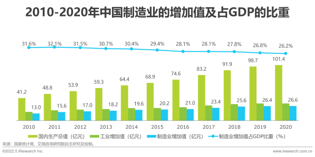 根據(jù)國(guó)家統(tǒng)計(jì)局公布的數(shù)據(jù)來(lái)看,中國(guó)規(guī)模以上制造業(yè)增加值從2011年的15.6萬(wàn)億元增長(zhǎng)至2020年的26.6萬(wàn)億元,復(fù)合增長(zhǎng)率為5.5%,平均增加值為21萬(wàn)億元。從規(guī)模以上制造業(yè)占國(guó)內(nèi)生產(chǎn)總值的比重來(lái)看,近10年占比雖整體下行,但其占比平均值仍保持在28.8%,制造業(yè)整體對(duì)經(jīng)濟(jì)的貢獻(xiàn)依然十分顯著。2020年,規(guī)模以上制造業(yè)增加值為26.6萬(wàn)億元,占國(guó)內(nèi)生產(chǎn)總值的比重為26.2%。