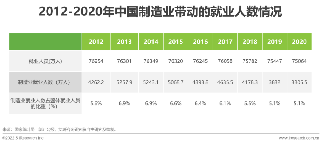 由國(guó)家統(tǒng)計(jì)局公布的數(shù)據(jù)來(lái)看,2020年,全國(guó)就業(yè)人員7.5億人,其中,制造業(yè)就業(yè)人員為3805.5萬(wàn)人,占比為5.1%。縱觀近10年制造業(yè)的就業(yè)人員情況,制造業(yè)企業(yè)帶動(dòng)的就業(yè)人員基本維持在6%左右,對(duì)國(guó)內(nèi)就業(yè)市場(chǎng)的穩(wěn)定貢獻(xiàn)功不可沒(méi)。