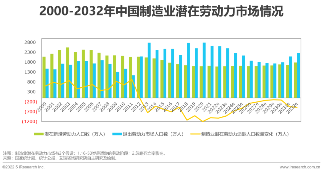 針對(duì)制造潛在勞動(dòng)力市場(chǎng):從2012年開(kāi)始,中國(guó)制造業(yè)的潛在勞動(dòng)力適齡人口數(shù)量變化(即潛在新增勞動(dòng)力人口數(shù)與退出勞動(dòng)力市場(chǎng)人口數(shù)之差)為負(fù)數(shù),持續(xù)到2021年底,制造業(yè)潛在勞動(dòng)力市場(chǎng)平均每年減少700萬(wàn)左右的適齡人口,并且制造業(yè)潛在勞動(dòng)力市場(chǎng)的適齡人口將持續(xù)減少的現(xiàn)象或?qū)⒕S持10年以上,帶來(lái)的影響可能就是行業(yè)潛在勞動(dòng)力不足或者制造業(yè)企業(yè)需要提供更具吸引力的工作環(huán)境、工作福利等來(lái)吸引年輕群體。
