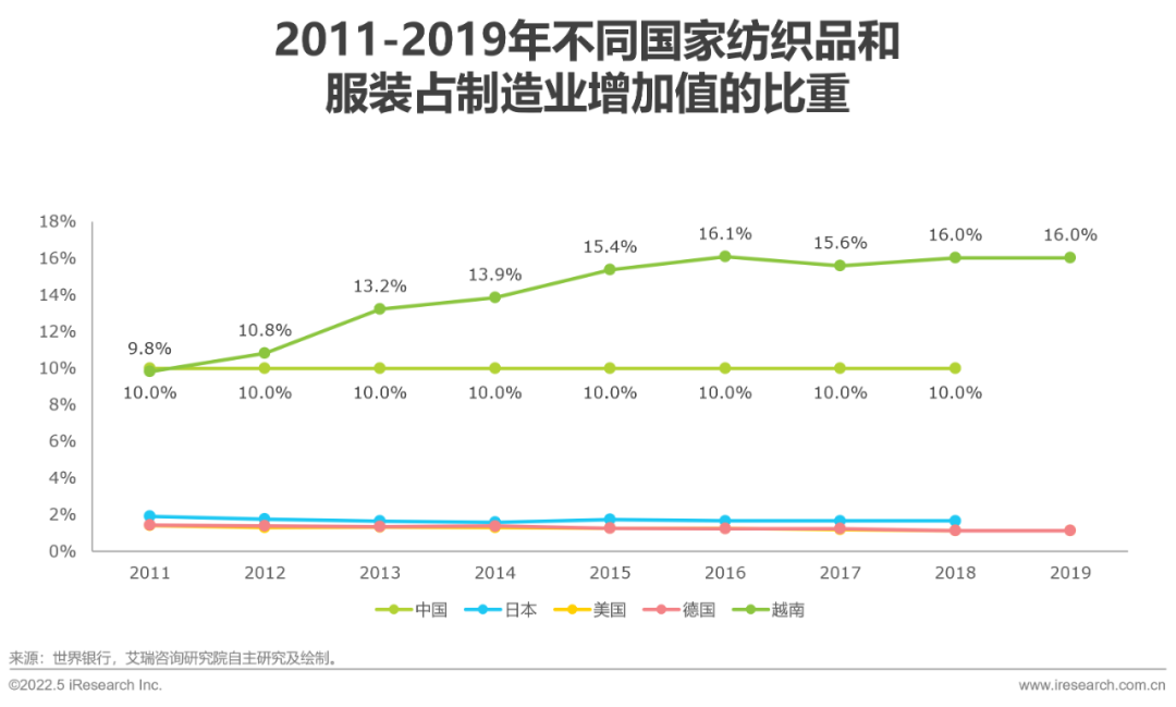 目前產(chǎn)業(yè)向成本更低的國(guó)家(如越南)轉(zhuǎn)移。以紡織品和服裝為例:據(jù)世界銀行公布的數(shù)據(jù),目前中國(guó)的紡織品和服裝占制造業(yè)的比重基本維持在10%,但是越南則呈明顯上升趨勢(shì),2019年,越南的紡織品和服裝占制造業(yè)的比重高達(dá)16%。結(jié)合歷史上前4次制造業(yè)轉(zhuǎn)移的兩個(gè)主要特點(diǎn)(向成本更低的國(guó)家或地區(qū)轉(zhuǎn)移、從技術(shù)相對(duì)低端的行業(yè)逐步滲透至相對(duì)高端的行業(yè))來(lái)看,制造業(yè)遷移的苗頭已經(jīng)顯現(xiàn),國(guó)內(nèi)制造業(yè)需要引起重視。