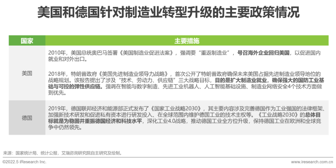 發(fā)達(dá)國(guó)家紛紛出臺(tái)政策引導(dǎo)制造業(yè)回流并轉(zhuǎn)型升級(jí),如美國(guó)和德國(guó)。美國(guó)奧巴馬政府和特朗普政府都出臺(tái)相關(guān)政策表示要“重返制造業(yè)”,同時(shí),還強(qiáng)調(diào)要在技術(shù)、供應(yīng)鏈等方面發(fā)力,確保美國(guó)占據(jù)先進(jìn)制造業(yè)的領(lǐng)導(dǎo)地位。德國(guó)則在2019年就提出《國(guó)家工業(yè)戰(zhàn)略2030》,并在次年將工業(yè)4.0升級(jí)為全國(guó)戰(zhàn)略,旨在保證就業(yè)的同時(shí),要在全球范圍內(nèi)維護(hù)德國(guó)工業(yè)的技術(shù)主權(quán)、保持德國(guó)工業(yè)在歐洲和全球競(jìng)爭(zhēng)中的領(lǐng)先地位、轉(zhuǎn)型升級(jí)為智能制造。
