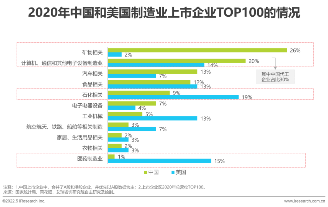 對(duì)比2020年中國(guó)和美國(guó)營(yíng)收TOP100的制造業(yè)上市企業(yè)數(shù)據(jù),中國(guó)的制造業(yè)企業(yè)更為集中,“礦物相關(guān)(26%)”、“計(jì)算機(jī)、通信和電子設(shè)備制造業(yè)(20%)”、“汽車(chē)相關(guān)(13%)”是TOP3大類(lèi),占比之和達(dá)59%。值得注意的是,“計(jì)算機(jī)、通信和電子設(shè)備制造業(yè)”中,以代工為主的企業(yè)占比30%,這也側(cè)面說(shuō)明中國(guó)的制造業(yè)缺少核心技術(shù)。反觀美國(guó), “石化相關(guān)”、“醫(yī)藥制造業(yè)”、“計(jì)算機(jī)、通信和電子設(shè)備制造業(yè)”是TOP3大類(lèi),占比之和為48%,其產(chǎn)業(yè)結(jié)構(gòu)更為分散。