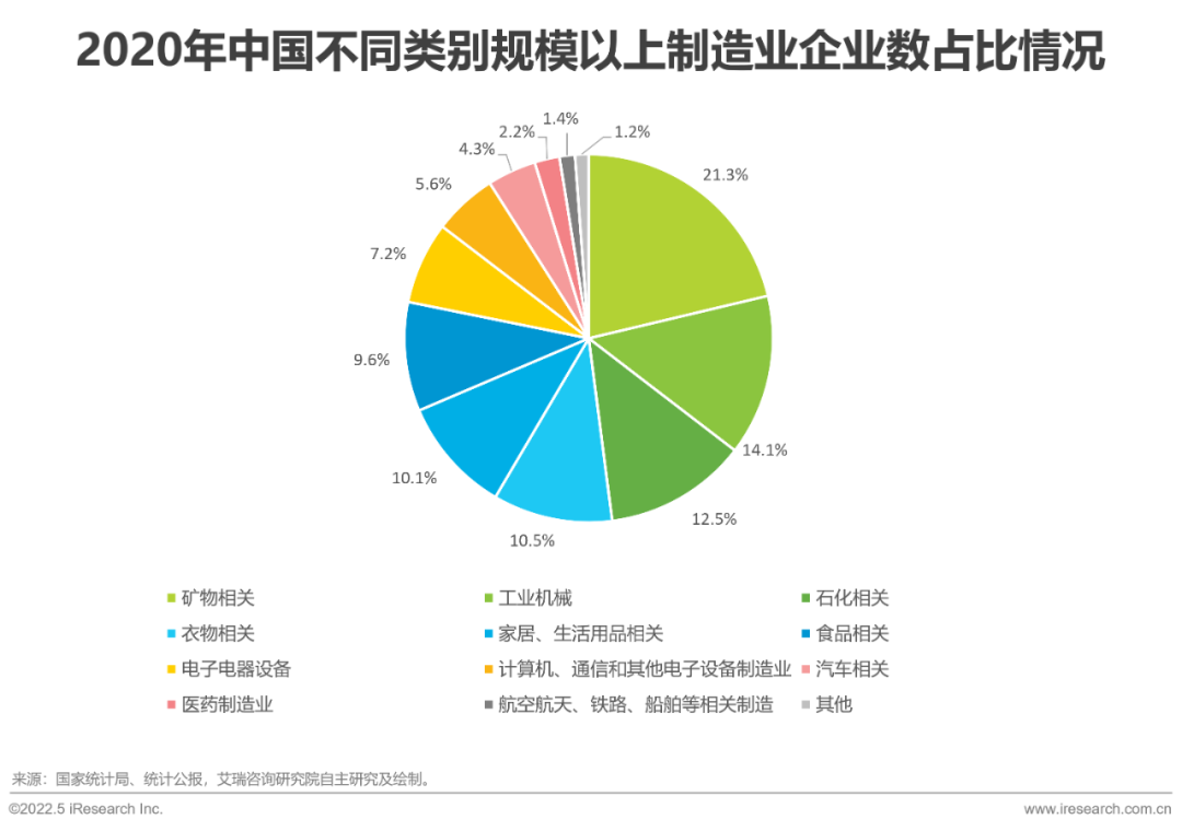 根據(jù)國(guó)家統(tǒng)計(jì)局發(fā)布的數(shù)據(jù),礦物相關(guān)、工業(yè)機(jī)械、石化相關(guān)是2020年不同類(lèi)別規(guī)模以上制造業(yè)企業(yè)數(shù)的TOP3,其占比總和達(dá)48%,其中礦物相關(guān)占比最高,占比為21.3%,中國(guó)的制造業(yè)整體偏向資源導(dǎo)向型。