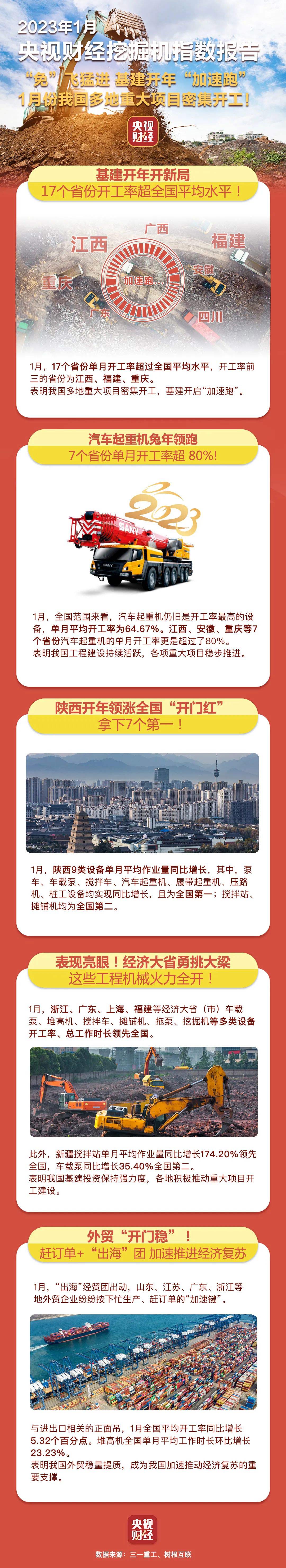 挖掘機是基礎設施建設的“標配”,是反映基礎設施建設、觀察固定資產投資等經濟變化的風向標。央視財經與三一重工、樹根互聯聯合打造的“央視財經挖掘機指數”今天發布了最新相關數據。今年1月份,全國各省份馬不停蹄開始了經濟“大比拼”,多地重大項目密集開工,基建開啟“加速跑”,力爭為兔年經濟開好頭、起好步。