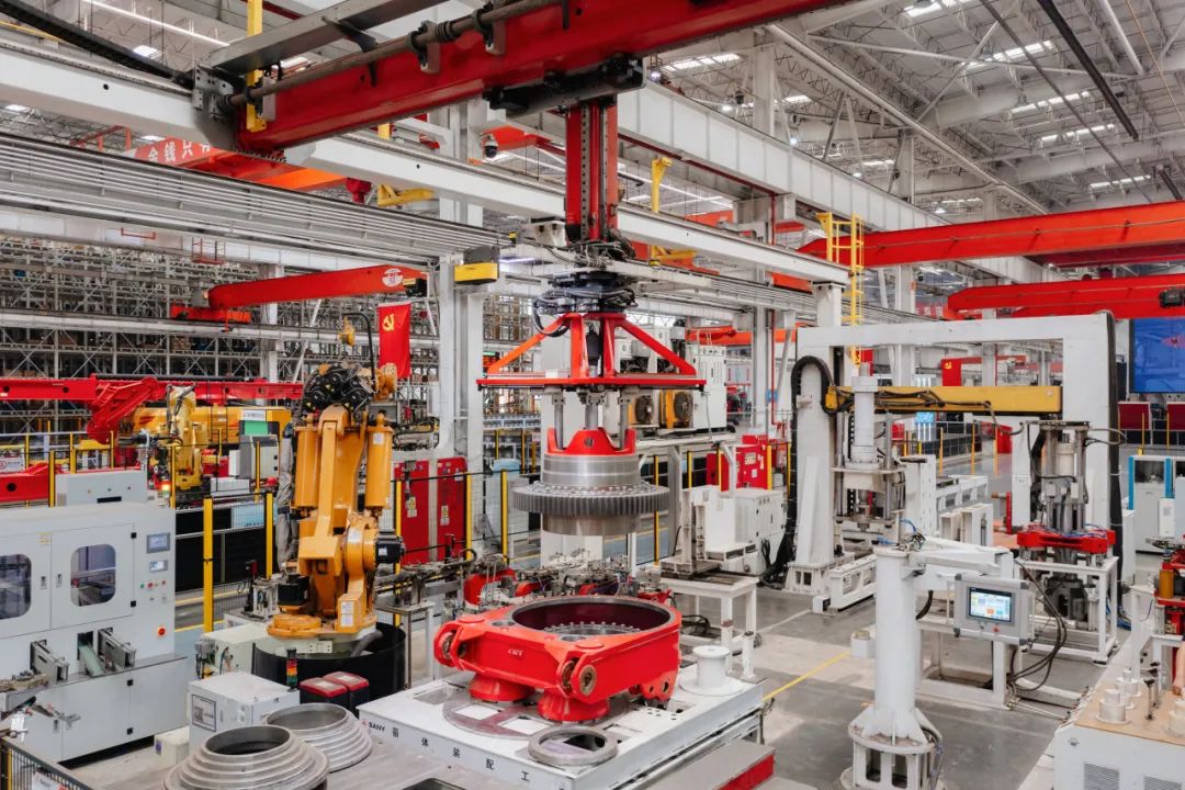 這樣的“鋼鐵巨象”是咋制造出來的?記者走進一個制造車間,只見三四層樓高的車間內,生產線上各式機器人整齊排列,正在忙碌工作。在焊接線上,幾臺配備自動焊槍的機器人,正在焊接一根20多米長的鉆桿:藍色弧光追逐著紅外線靶點和軌跡,夾雜著脈沖般“吱吱”作響的焊接聲……記者仔細尋找,終于在眾多機器人間發現幾名工人。與人們印象中揮汗如雨的形象不同,工人們現在更像是在“照看”機器人,督促其認真工作。
