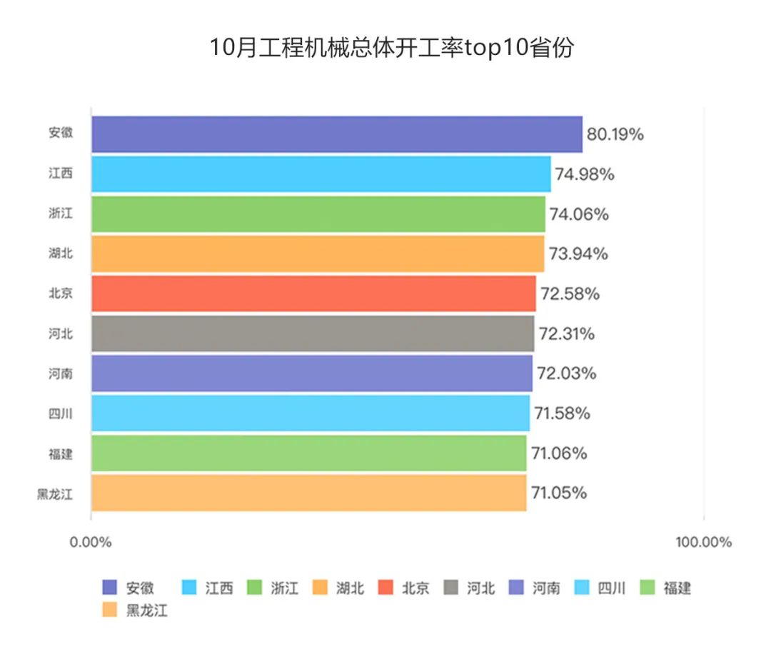 2023年10月,挖掘設(shè)備平均開(kāi)工率65.79%,環(huán)比9月增長(zhǎng)4.11個(gè)百分點(diǎn)。其中,挖掘機(jī)是所有設(shè)備里面開(kāi)工率增長(zhǎng)省份數(shù)量最多的,共有29個(gè)省份實(shí)現(xiàn)開(kāi)工率環(huán)比正增長(zhǎng)。在這之中,有17個(gè)省份開(kāi)工率環(huán)比增長(zhǎng)超過(guò)3個(gè)百分點(diǎn)。