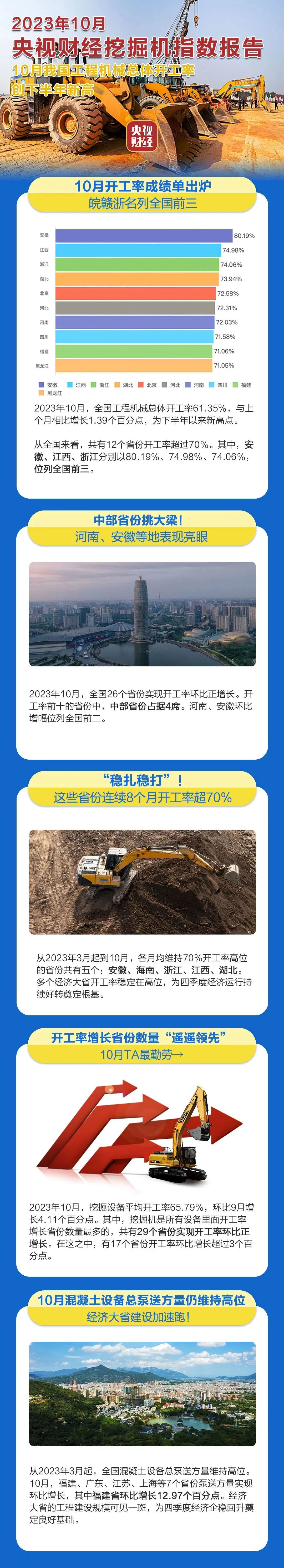 挖掘機(jī)是基礎(chǔ)設(shè)施建設(shè)的“標(biāo)配”,是反映基礎(chǔ)設(shè)施建設(shè)、觀察固定資產(chǎn)投資等經(jīng)濟(jì)變化的風(fēng)向標(biāo)。央視財(cái)經(jīng)與三一重工、樹(shù)根科技聯(lián)合打造的“央視財(cái)經(jīng)挖掘機(jī)指數(shù)”日前發(fā)布了最新相關(guān)數(shù)據(jù)。10月我國(guó)工程機(jī)械總體開(kāi)工率61.35%,創(chuàng)下半年新高。我國(guó)各項(xiàng)基礎(chǔ)設(shè)施建設(shè)加速,多組數(shù)據(jù)展現(xiàn)中國(guó)經(jīng)濟(jì)澎湃動(dòng)能,高質(zhì)量發(fā)展穩(wěn)步推進(jìn)。
