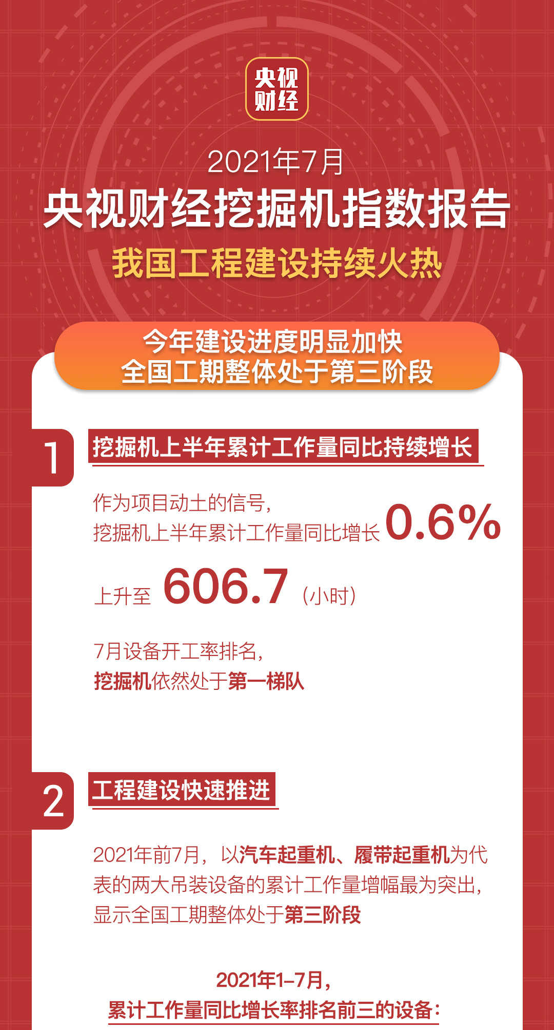 開工先動(dòng)土,挖掘機(jī)作為各類工程建設(shè)開工的信號(hào)。央視財(cái)經(jīng)挖掘機(jī)指數(shù)顯示,為了應(yīng)對(duì)疫情影響,各地加大基建穩(wěn)投資力度,新工程動(dòng)土需求逐步釋放,去年以來挖掘機(jī)始終處于高開工率的狀態(tài),去年全年挖掘機(jī)的累計(jì)工作量同比大幅增長(zhǎng)12.9%。今年上半年繼續(xù)保持穩(wěn)步增長(zhǎng)態(tài)勢(shì),2021年1到6月挖掘機(jī)累計(jì)工作量同比小幅上升0.6個(gè)百分點(diǎn),從去年同期的603.2(小時(shí))上升至606.7(小時(shí))。