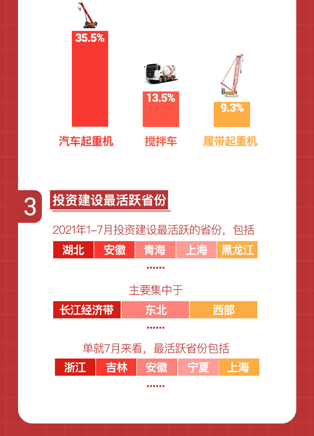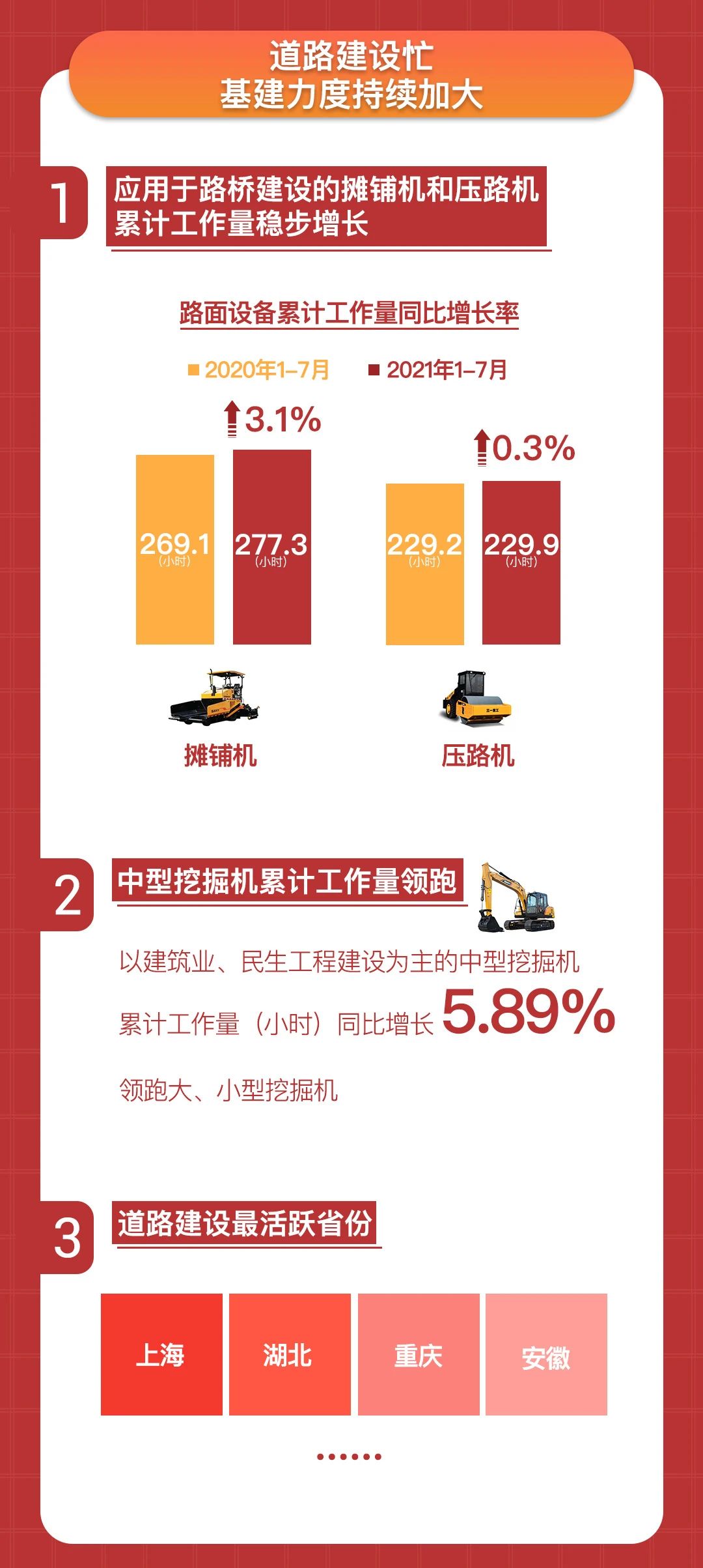 從開工率和作業(yè)時(shí)長(zhǎng)來看,今年1到7月投資建設(shè)最活躍的區(qū)域,包括湖北、安徽、青海、上海、黑龍江等,主要集中于長(zhǎng)江經(jīng)濟(jì)帶、東北、西部等地區(qū);單從7月來看,最活躍的區(qū)域包括浙江、吉林、安徽、寧夏、上海等。業(yè)內(nèi)人士表示,今年是十四五規(guī)劃的開局之年,隨著大量基建項(xiàng)目的陸續(xù)展開,預(yù)期下半年各類工程機(jī)械的開工率和作業(yè)時(shí)長(zhǎng)會(huì)持續(xù)保持高位增長(zhǎng)。