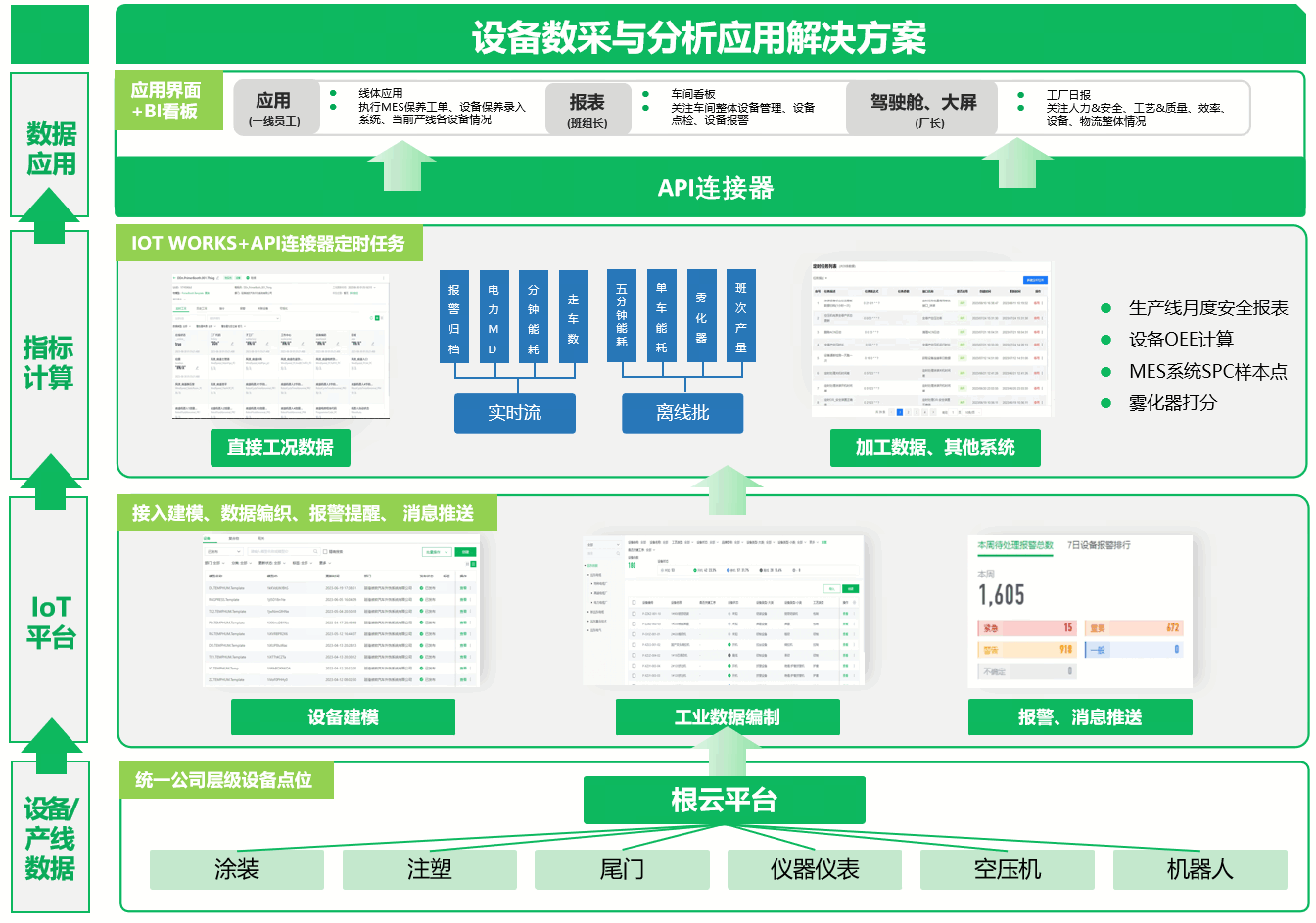 提供設備數采、數據建模、數據分析(包括設備OEE、工時優化、工藝執行監控、輔料消耗優化)等功能