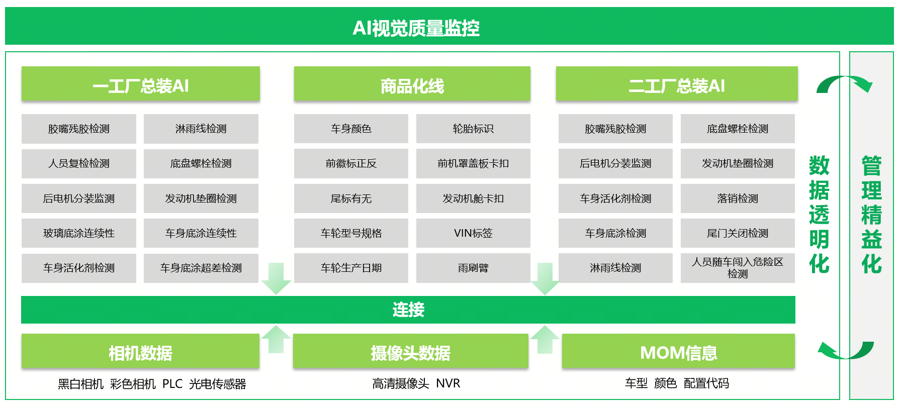 主要提供AI視覺檢測功能,包括:輪胎型號識別、整車顏色識別、徽標識別、標簽識別等。解決方案包括視覺模組、管理軟件、算法軟件等內容。
